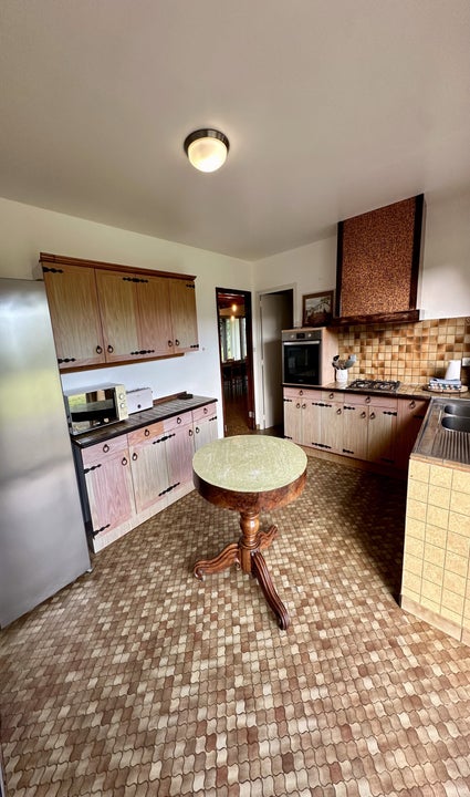 La cuisine de 13 m² équipée d’un grand four, d’un micro-onde, d’un lave-vaisselle, d’un réfrigérateur avec compartiment congélateur et d’une petite table ronde au centre. Elle comprend bien sûr un évier avec eau chaude et froide, une plaque de cuisson 4 feux, de la batterie de cuisine et vaisselle suffisantes pour 12 personnes, et d’un autocuiseur.